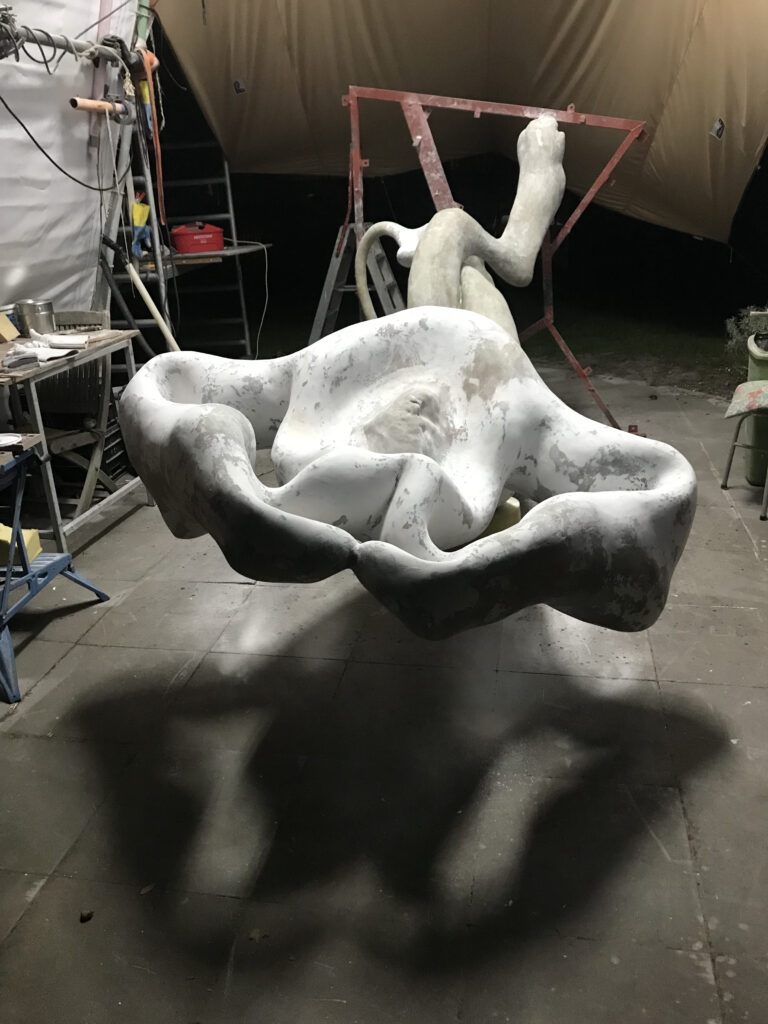 Het begon met een gezichtje, dat terloops ontstond vanuit een plaat boetseerwas, en waarin ik een combi van lijden, arrogantie en slaap zag die mij fascineerde. Op basis daarvan wilde ik een soort extreme pronkeboon maken, iemand die erg van zichzelf en zijn goedheid vervuld is, en over je heen kijkt. Toen heb ik dat gezicht letterlijk, met gaas en polyester laten uitwaaieren tot een complete figuur. Ik heb me daarbij zo weinig mogelijk ingehouden. Het geheel is de uiterste consequentie van dat gezichtje geworden.